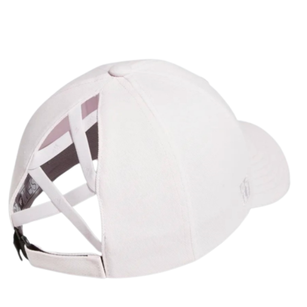 Style and function for the win. This adidas golf hat features a crisscross elastic back made for sliding your ponytail through. Adjust the strap for a custom fit. The cotton twill construction delivers all-day comfort. Our cotton products support more sustainable cotton farming.