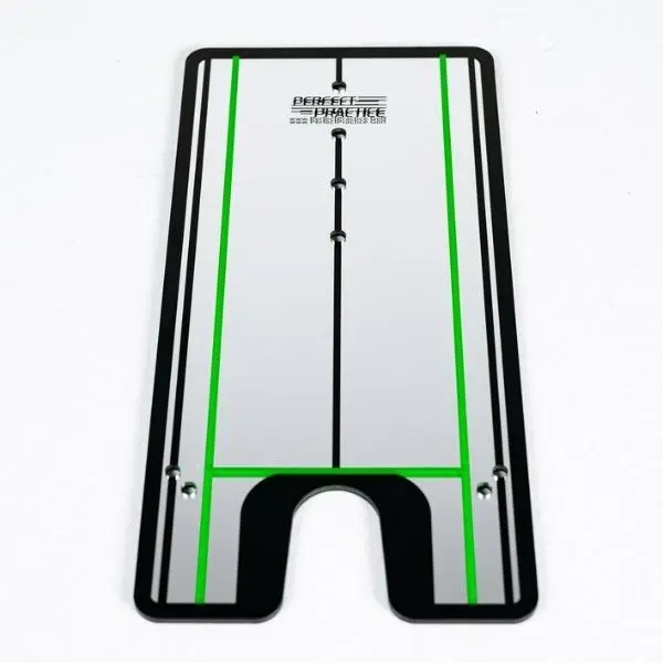 Like all putting mirrors, the Perfect Practice small Putting Mirror is a reflective, unbreakable mirror that shows you where your eyes are relative to both the golf ball and the putter face. The Putting Mirror has a slot for the golf ball as well as lines to indicate a square relative to the putter face.